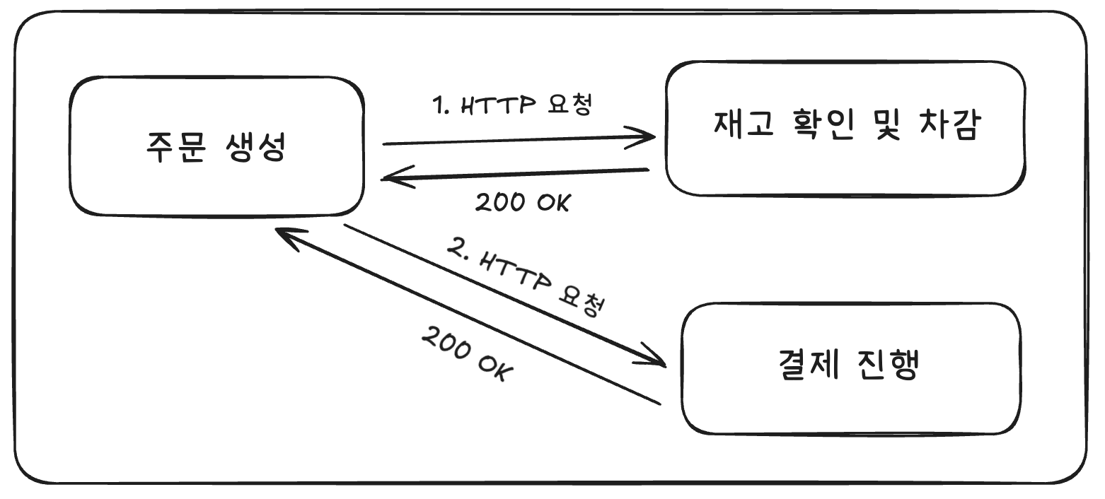 주문 서비스가 재고 서비스를 호출하고, 결제 서비스를 호출해서 주문 생성 이후의 흐름을 HTTP 통신을 통해서 진행하는 것이 하나의 예시이다.