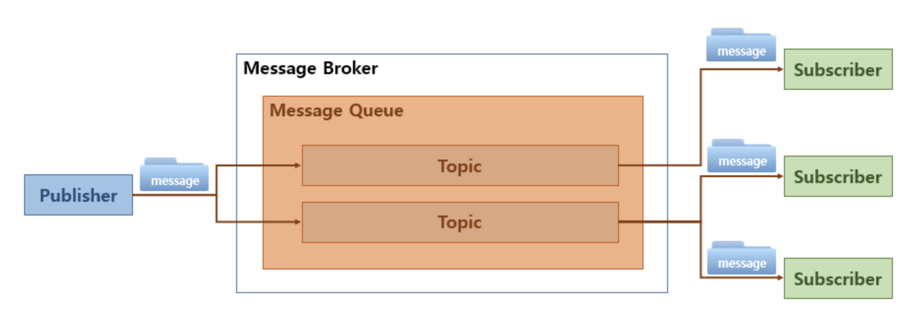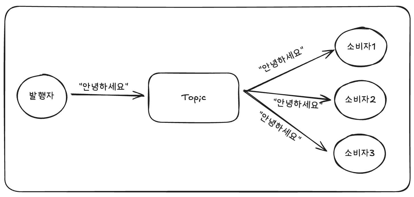 발행자가 특정 토픽에 메시지를 발생하면, 해당 토픽을 구독하고 있는 모든 구독자에게 메시지가 복사되어 전달된다.