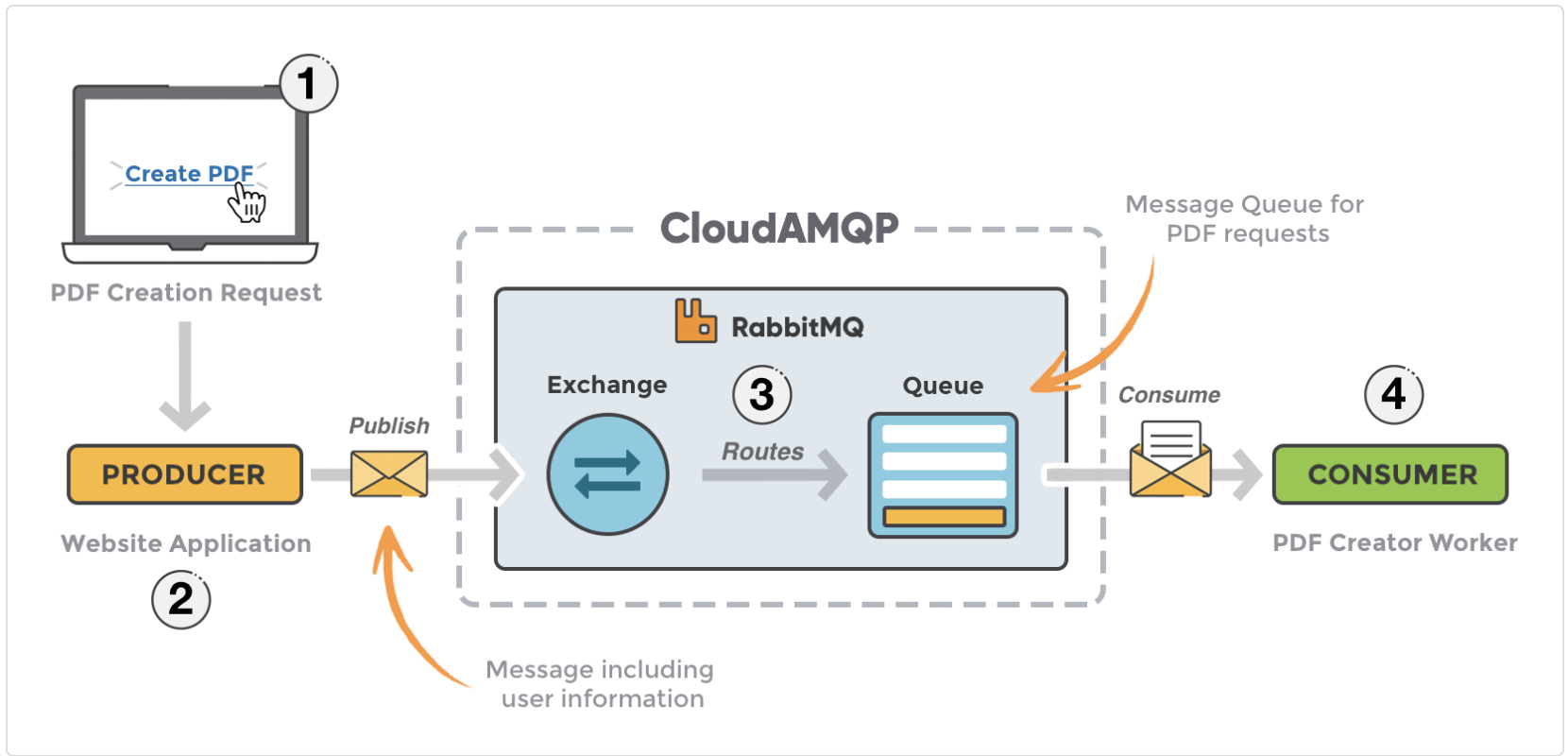 - Producer : 메시지를 발행하는 주체이다. AMQP, STOMP 등의 프로토콜로 RabbitMQ와 통신하며 메세지를 생성해 전달한다.