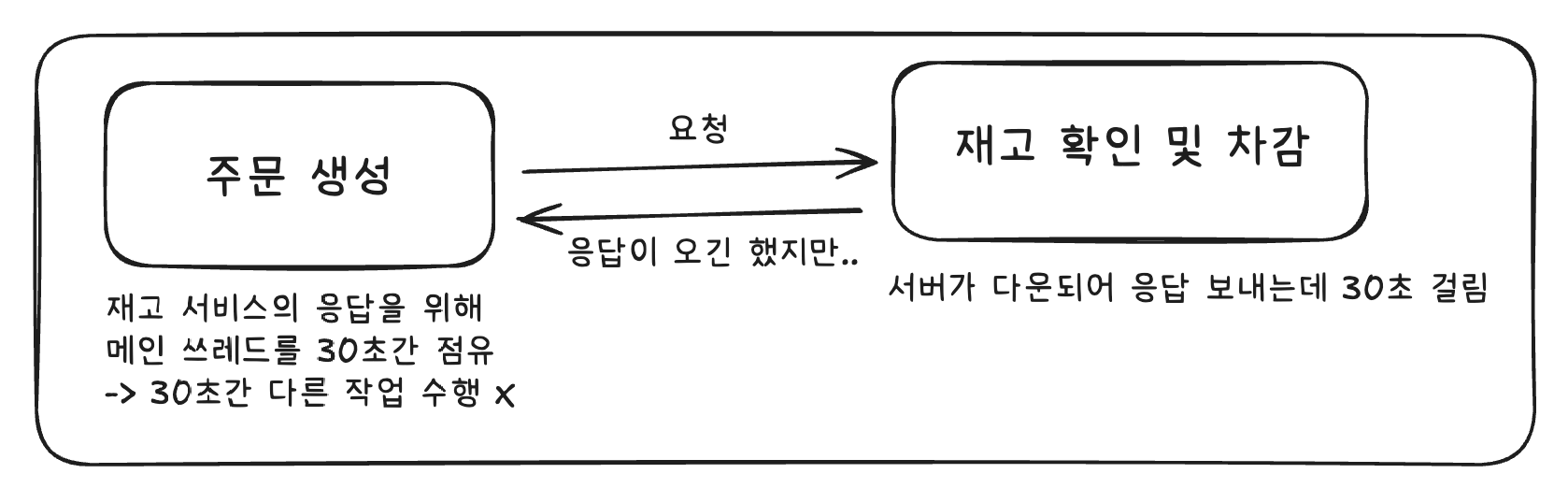 - 결합도 : 주문 서비스는 재고 서비스의 응답을 기다려야하기 때문에, 재고 서비스가 다운되거나 트래픽이 증가해 느려진다면, 주문 서비스도 함께 느려지는 것처럼 영향을 받게 된다.